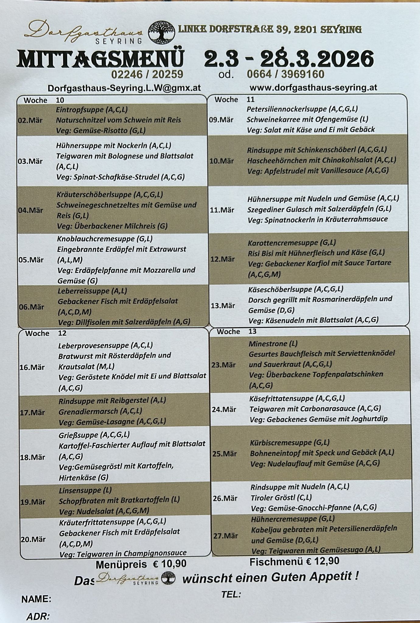 Montag–Freitag: täglich wechselndes Menü